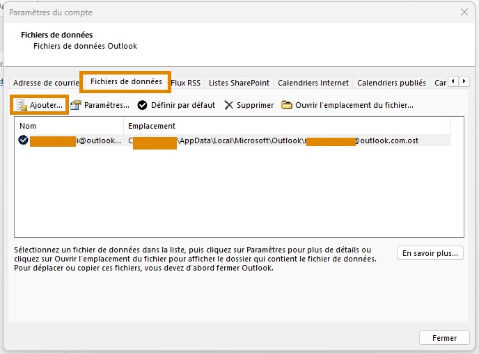 Étape 5 : Une fenêtre s’ouvre, allez dans l’onglet : Fichiers de données, puis cliquez sur : Ajouter