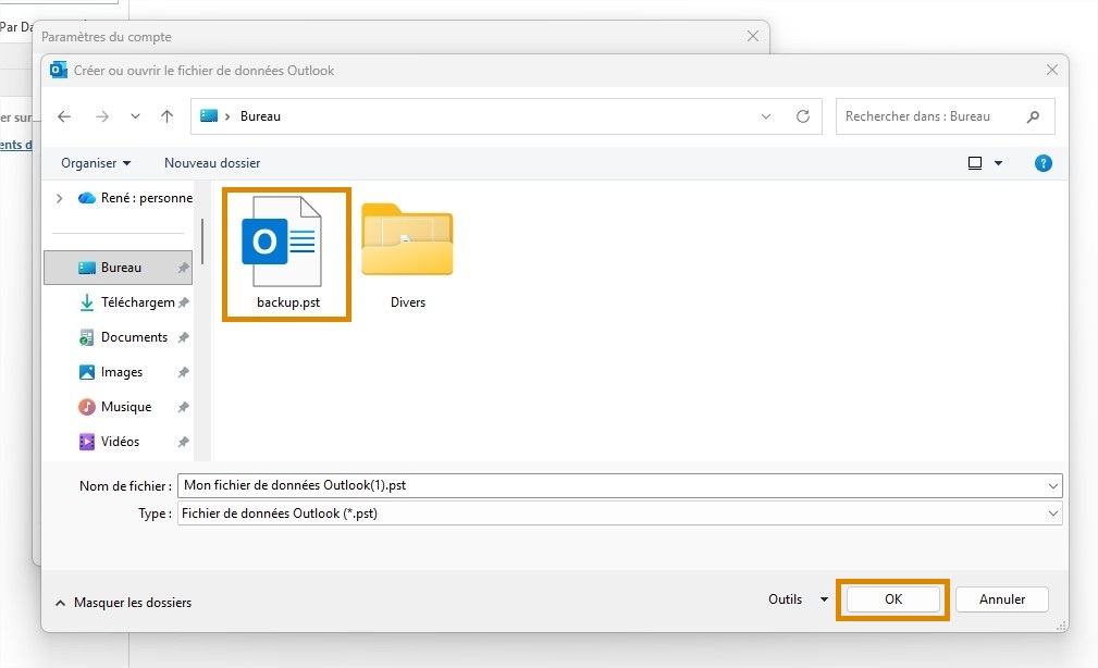 Étape 6 : Une fenêtre de l’explorateur de fichiers s’ouvre : recherchez le fichier .pst que vous avez préalablement stocké sur votre ordinateur, puis sélectionnez-le, puis cliquez sur : OK