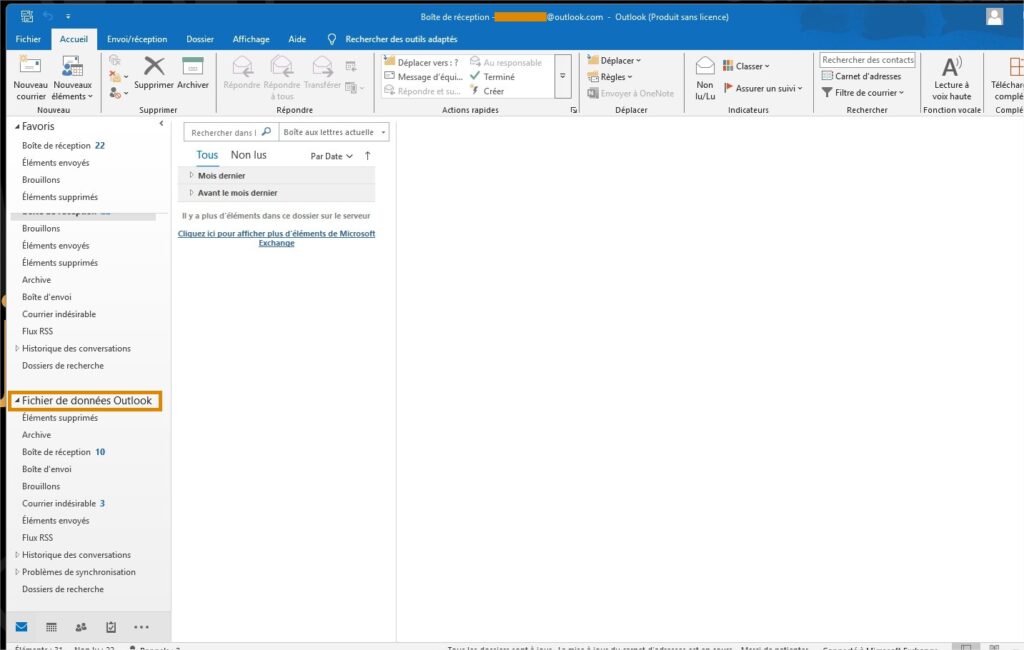 Étape 7 : Vous retrouverez vos e-mails archivés en bas à gauche d’Outlook, sous le nom Fichiers de données Outlook.